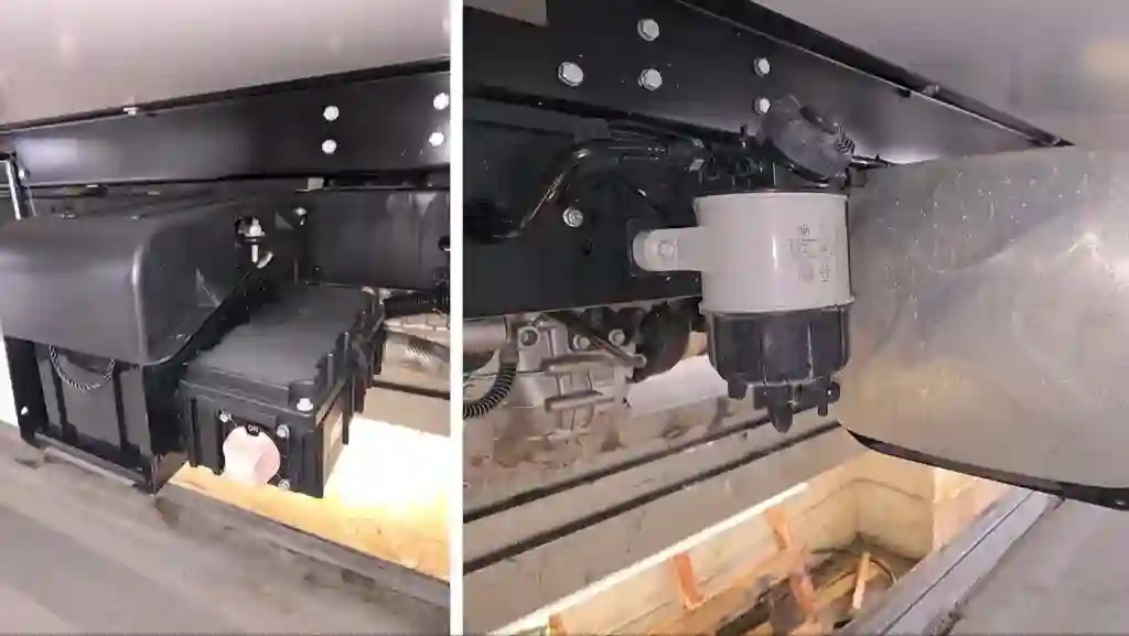 КБ с увеличенной до 120 Ач ёмкостью закрыта защитным кожухом. Рядом выключатель массы. Ёмкость алюминиевого топливного бака увеличена с 75 до 100 л. По соседству с баком топливный фильтр с подогревом