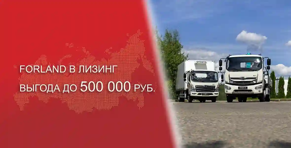 Экслюзивный дистрибьютор FORLAND в РФ, компания АО «МБ РУС», объявляет акцию на приобретение грузовиков на шасси Forland 3, Forland 8 и Forland 12. В период с 1 февраля до 31 марта на эти модели действует скидка до 500 тысяч рублей, в случае приобретения в лизинг у лизинговых компаний, участвующих в акции. Подробнее на официальном сайте: https://forland-russia.ru/financial-services/leasing/